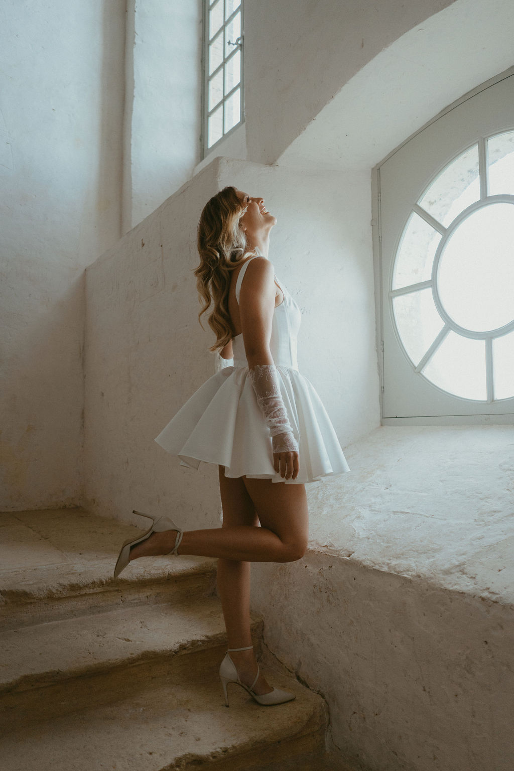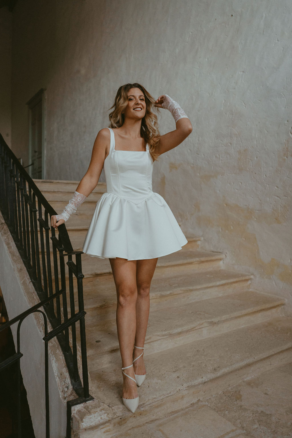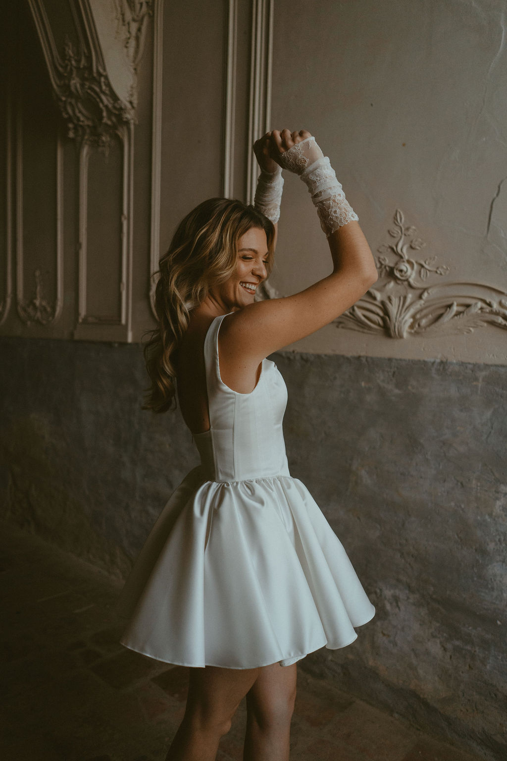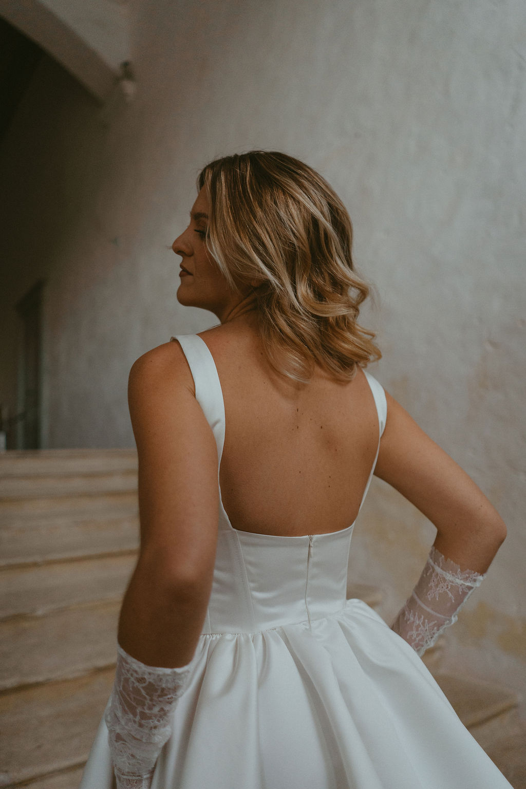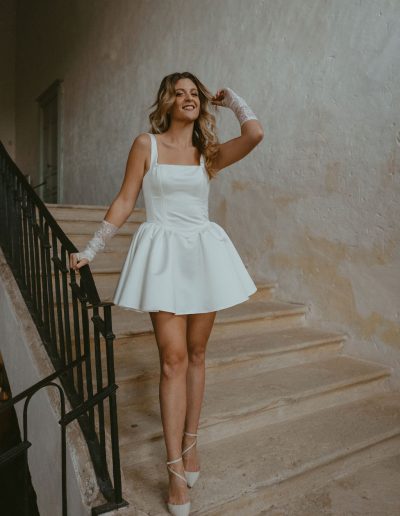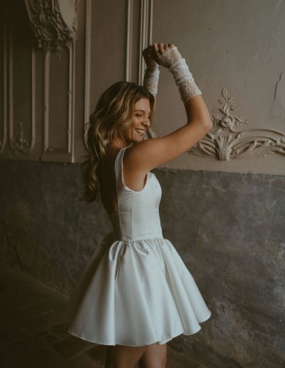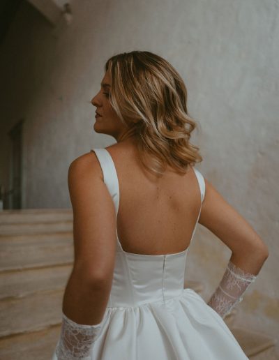 Variation I s’adresse aux mariées audacieuses, en quête d’une robe de mariée courte, originale et affirmée, qui ne renonce ni à l’élégance ni au confort.
