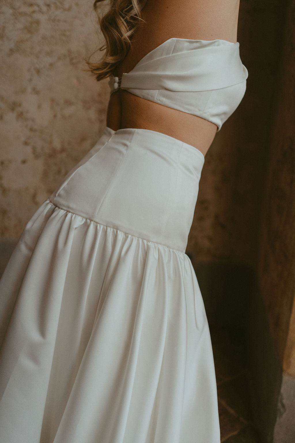 Confectionnée en satin duchesse, Variation II affirme une silhouette moderne et résolument couture. Son crop-top structuré, bien plus qu’un simple bandeau, est travaillé avec des baleines et des coques intégrées, garantissant maintien, confort et liberté de mouvement. Le détail de la torsade apporte une touche subtilement sophistiquée et souligne le travail de construction.