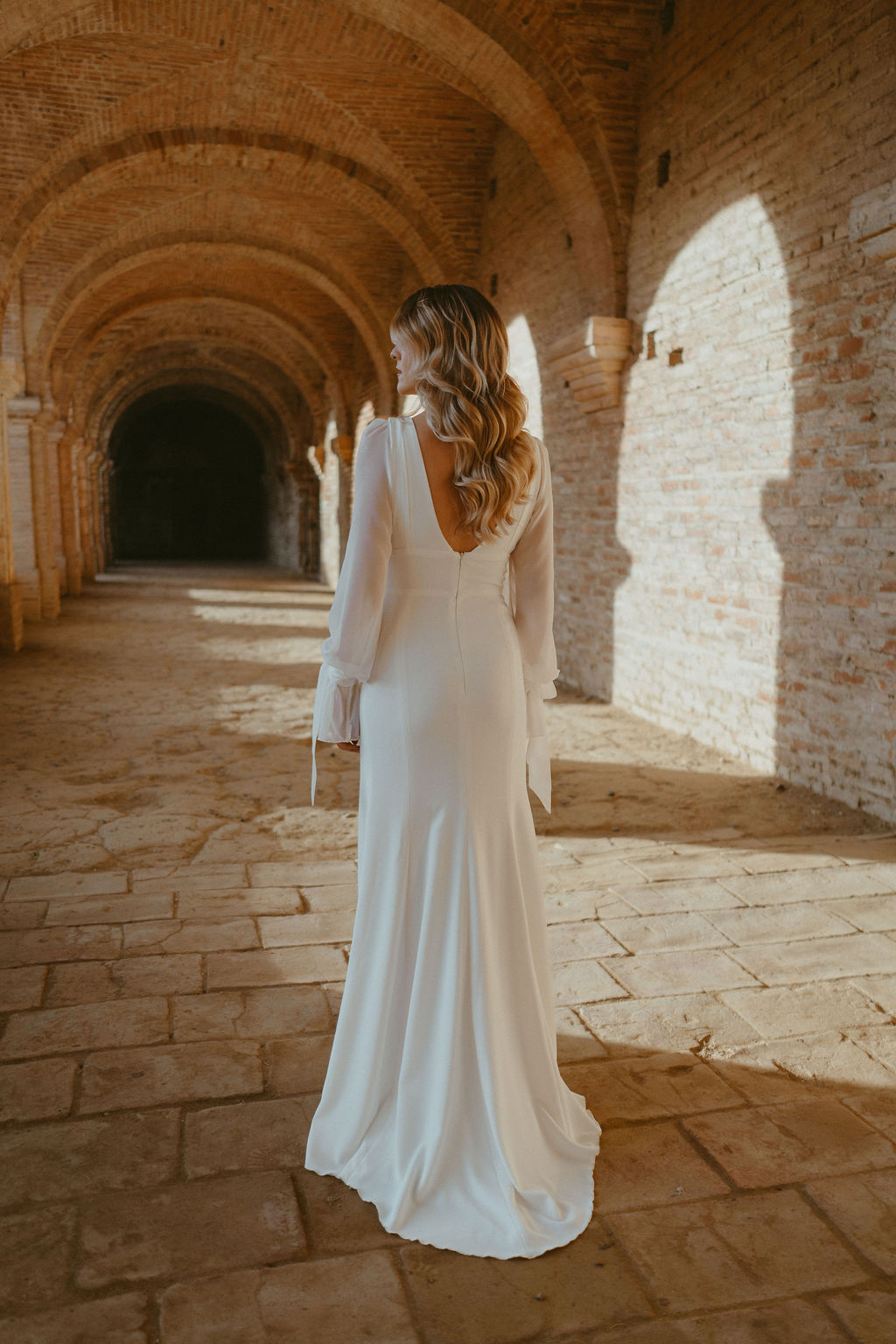 Son dos croisé, fermé par des boutons délicats, structure la silhouette et crée une seconde lecture de la robe. Cette pièce permet d’accompagner les différents moments de la journée, en ajoutant une dimension couture et cérémonielle à l’ensemble.