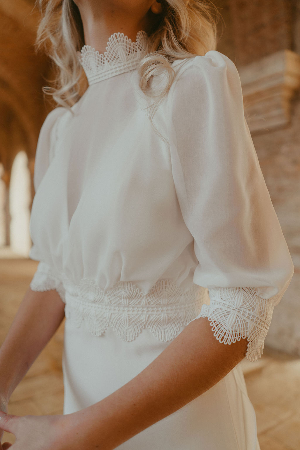 Ces manches bouffantes amovibles, confectionnées en mousseline, offrent la liberté de modifier la silhouette au fil de la journée. Leur volume délicat apporte douceur et féminité, tandis que la transparence de la matière conserve une sensation de légèreté.