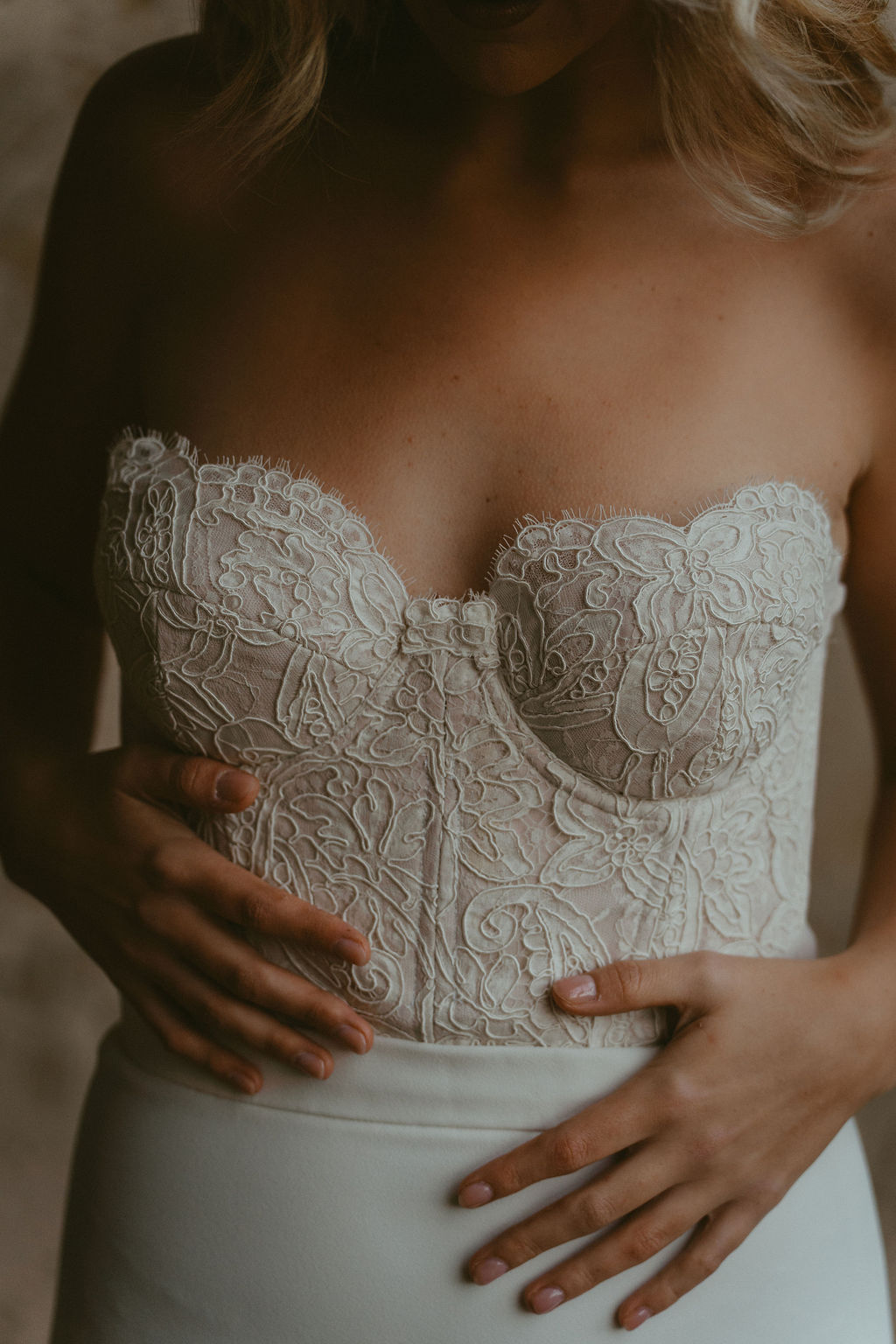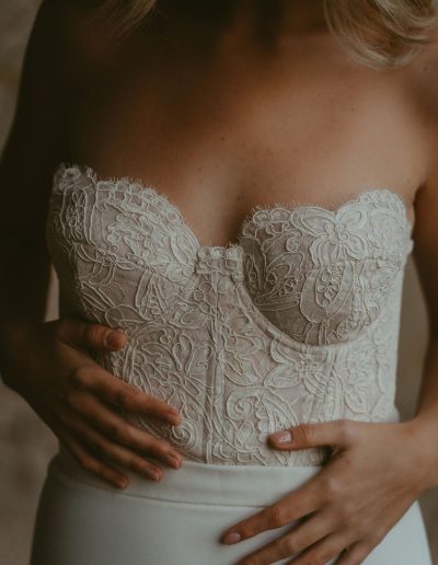 Le bustier travaillé est conçu pour offrir maintien et confort, tout en mettant en valeur le buste avec précision. La dentelle de Calais apporte un jeu de textures raffiné et un détail couture délicat, contrastant avec la simplicité assumée de la silhouette.