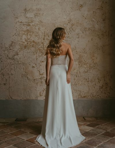 Le bas de robe en crêpe, fluide et agréable à porter, accompagne naturellement les mouvements. La fente vient ponctuer la ligne d’une touche de féminité et de modernité, révélant juste ce qu’il faut.