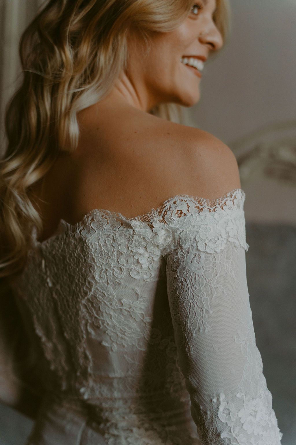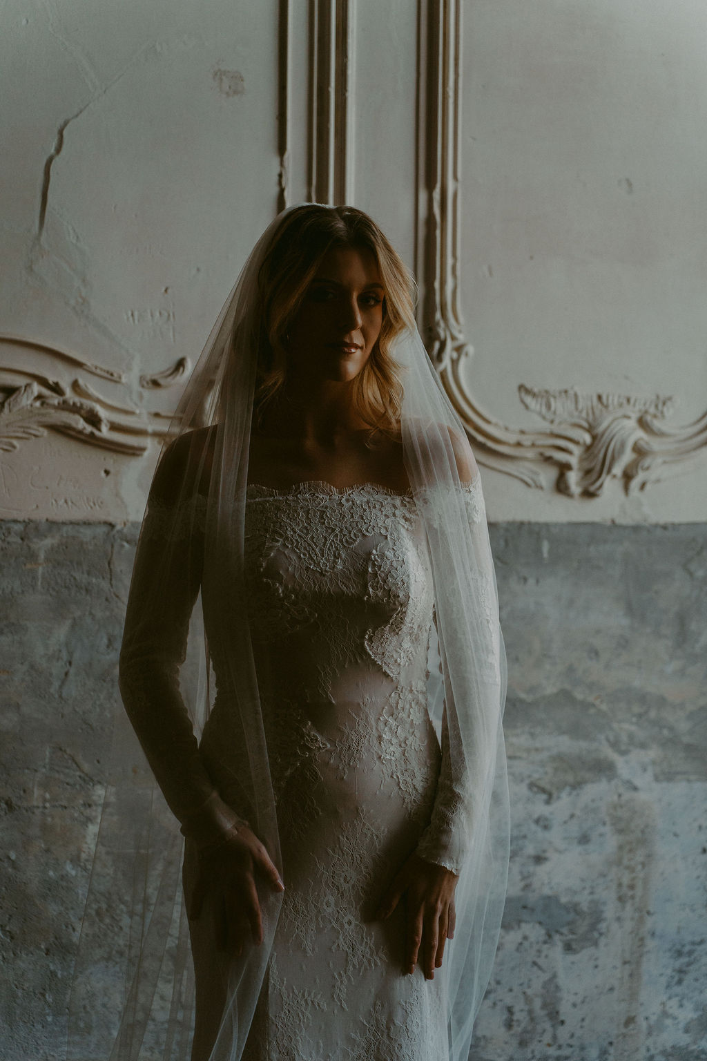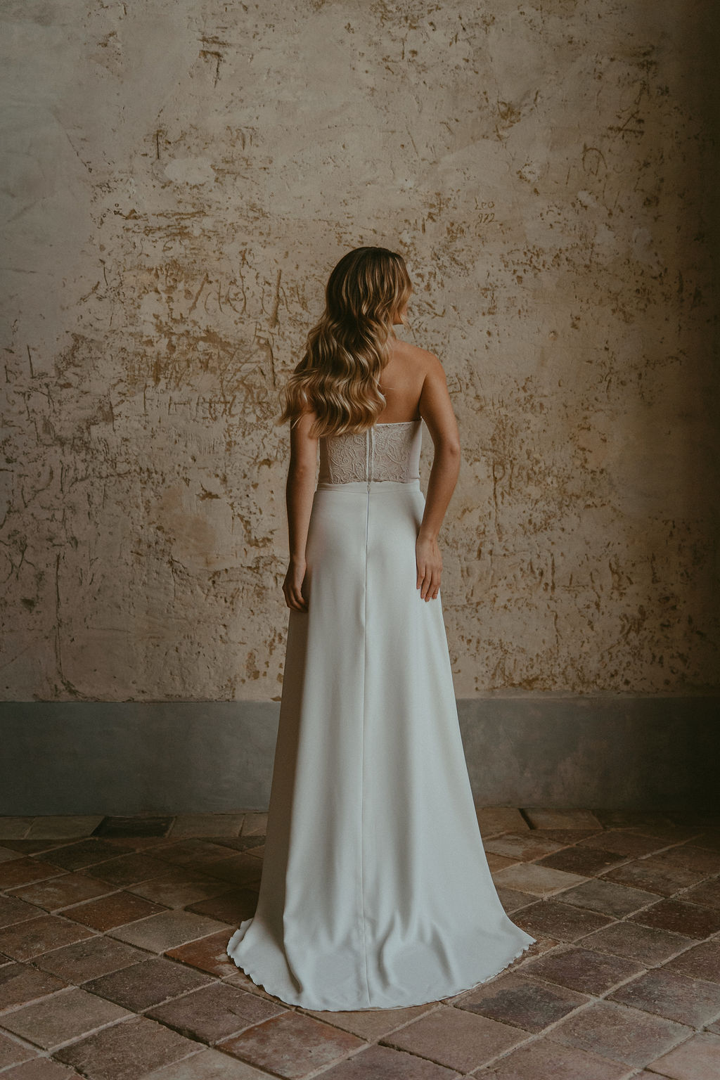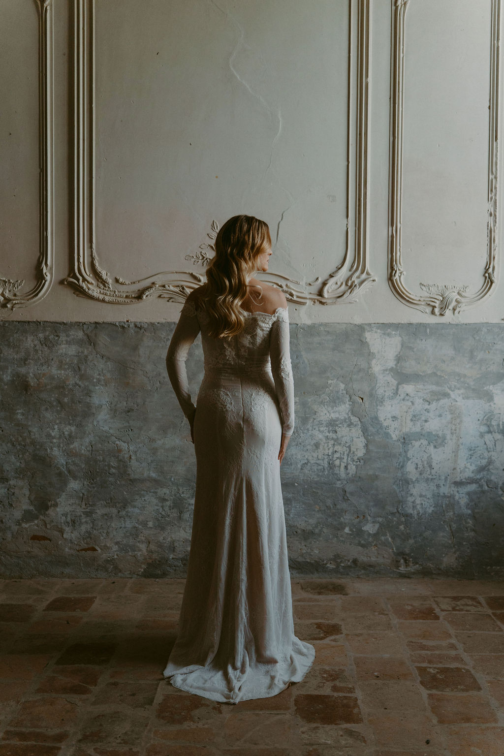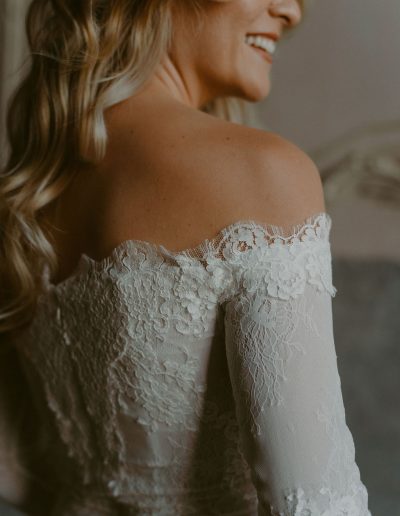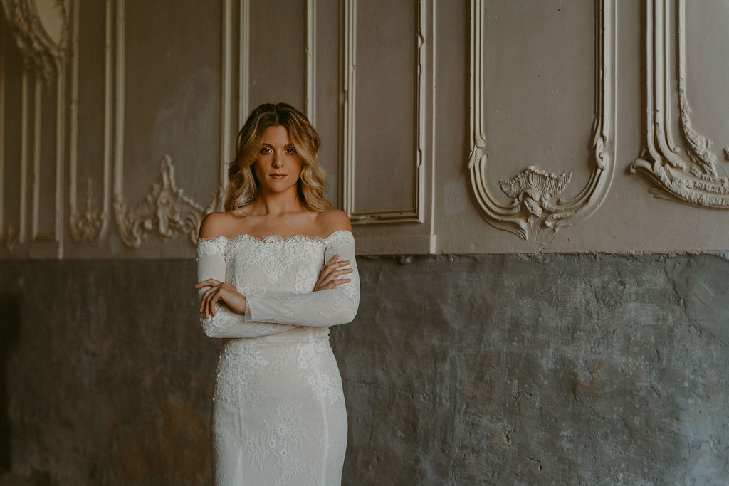 Les manches en dentelle viennent parfaire la tenue et renforcent son caractère sophistiqué, tandis que l’encolure Bardot dévoile les épaules avec douceur, apportant une touche de sensualité et d’intemporalité. Variation V peut être complétée par un voile, pour une allure encore plus poétique et enveloppante.