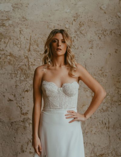 Variation IV s’adresse aux mariées en quête d’une robe de mariée élégante, intemporelle et délicatement structurée, où chaque détail est pensé avec justesse.